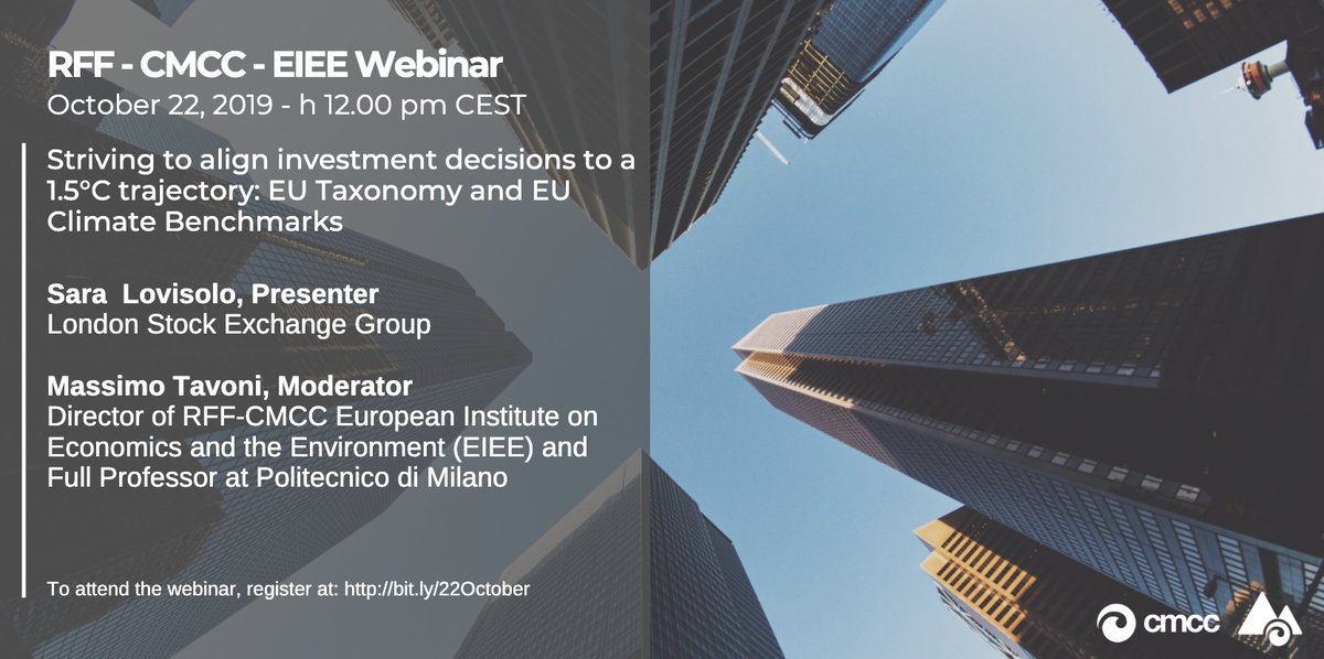 CMCC Webinar 🌍 22 October h12:00 pm CEST Striving to align investment decisions to a 1.5°C trajectory: EU Taxonomy and EU Climate Benchmarks Presenter: Sara Lovisolo @LSEGplc Moderator: @tavoni_massimo @EIEEorg @polimi To attend register at http://bit.ly/22October pic.twitter.com/kIdryXm99o