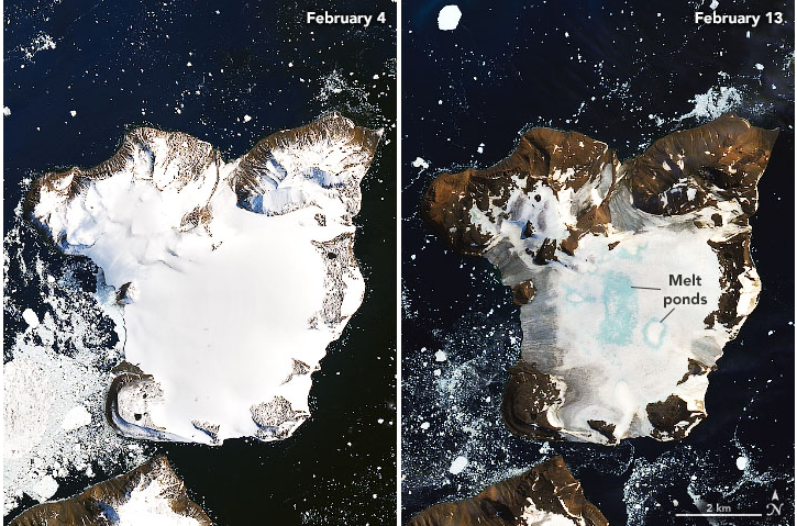 Satellite images show the effects of a prolonged warm spell on Eagle Island, in the far north of the Antarctic Peninsula, NASA says.
