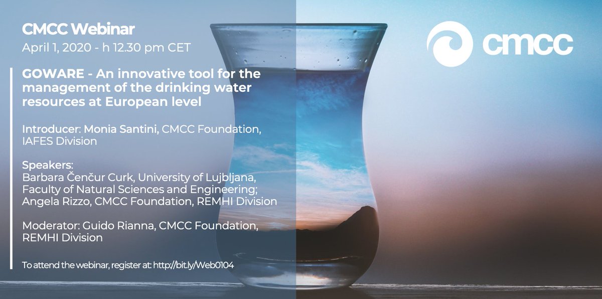 CMCC Webinar 🌍 1st April h 12:30 pm CET GOWARE - An innovative tool for the management of the drinking water resources at European level Introducer: Monia Santini Speakers: Barbara Čenčur Curk, Angela Rizzo Moderator: @guido80r To attend register at: http://bit.ly/Web0104 pic.twitter.com/rYkN2eDdhi