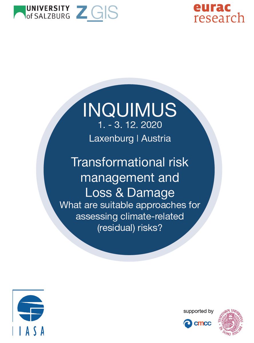 #INQUIMUS2020: 1st – 3rd Dec 2020 @IIASAVienna Transformational risk management and Loss & Damage: What are suitable approaches for assessing climate-related (residual) risks? Call for abstracts is open! Deadline 15 May 2020 @CaFoscari @EURAC @UniSalzburg http://www.inquimus.org/ pic.twitter.com/c8GuuXNvzu