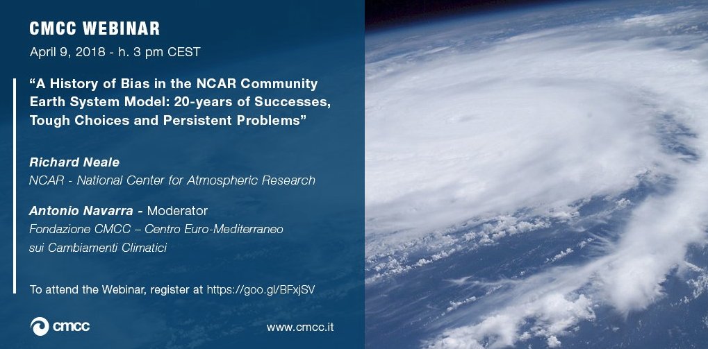 #Webinar A history of bias in the NCAR Community Earth system model: 20-years of successes, tough choices and persistent problems Monday, April 9 2018 h. 3 pm CEST Presenter: Richard Neale Project Scientist at @NCAR_Science