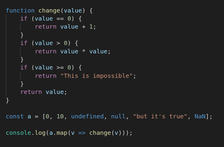 0: 1 1: 100 2: undefined 3: "This is impossible" 4: "but it's true" 5: NaN length: 6