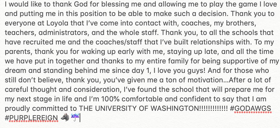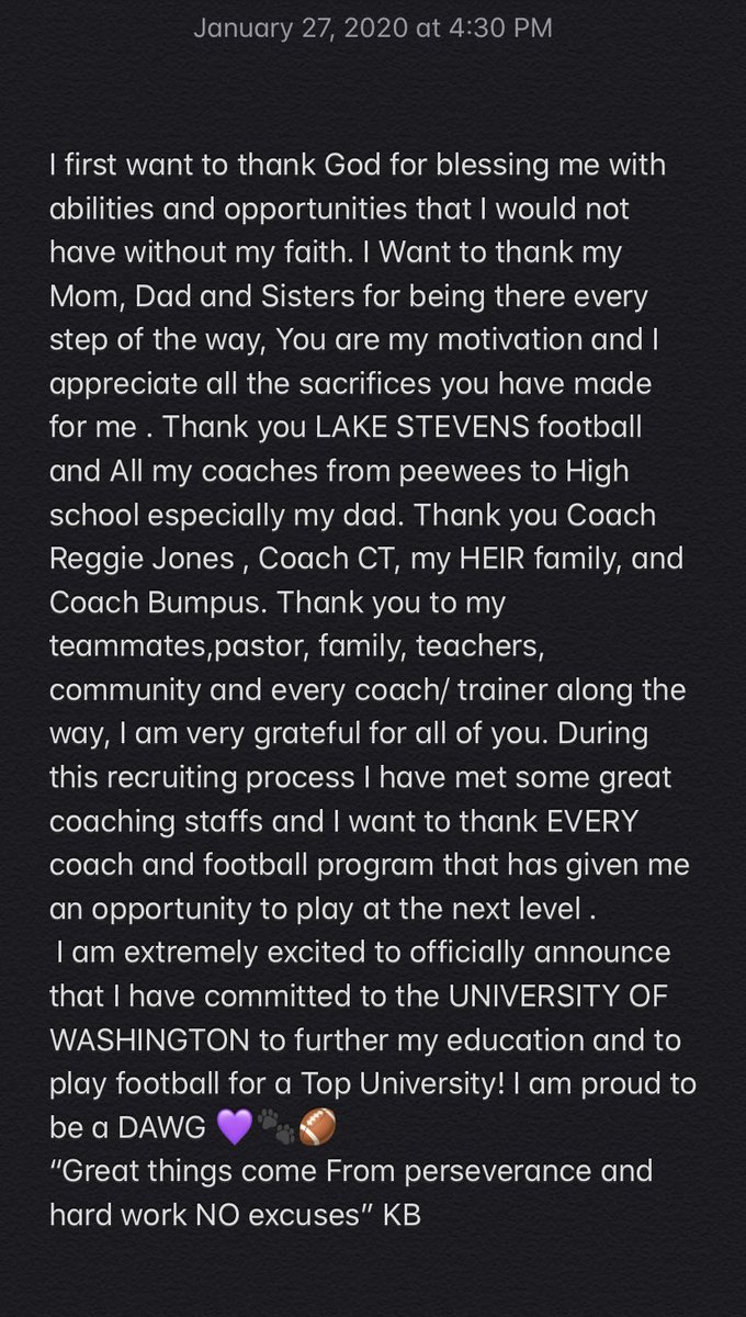I want to thank God first for this opportunity to continue my football career at the University of Washington! Also a big thanks to all the coaches who have trained me and to all the coaches who recruited me!