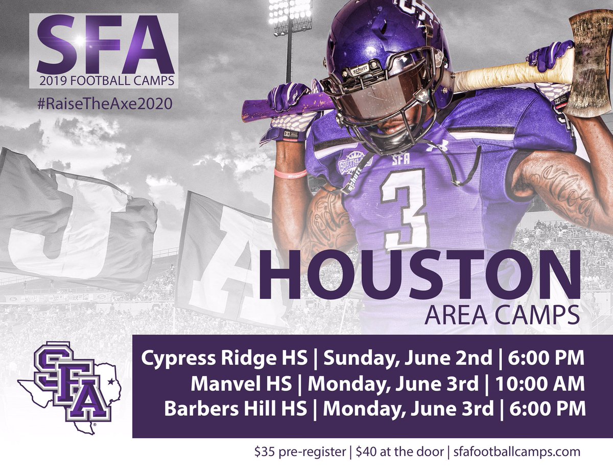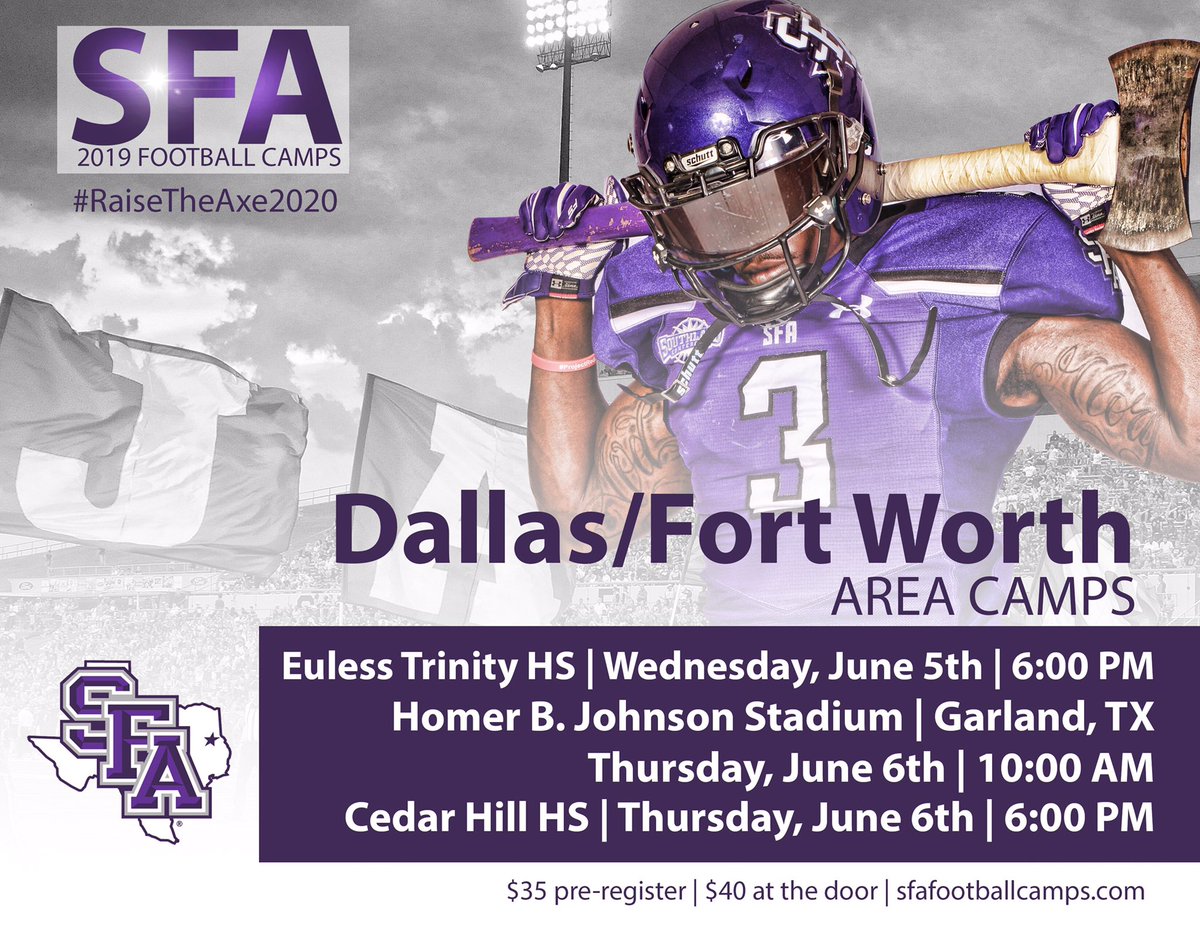 @SFA_Football camps across the great state of Texas this summer! It’s 3 hours of real football when you#CampWithTheJacks, so you better be ready to work and elevate your game...#AxeEm#RaiseTheAxe2020 Register now at: https://www.sfafootballcamps.com pic.twitter.com/CnnkvsP39s
