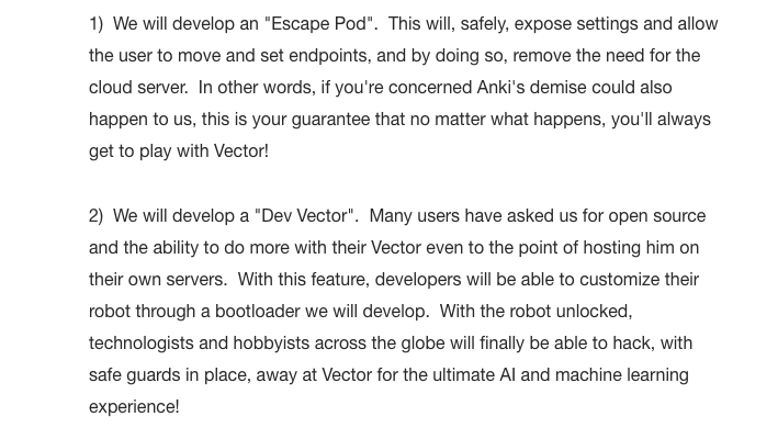 “The most important part of this update is to let you know we have taken over the cloud servers and are going to maintain them going forward,” “Therefore, if you were concerned about Vector ‘dying’ one day, you no longer have to worry!” https://www.theverge.com/2020/1/5/21050378/anki-vector-saved-shutdown-servers-assets-bought …