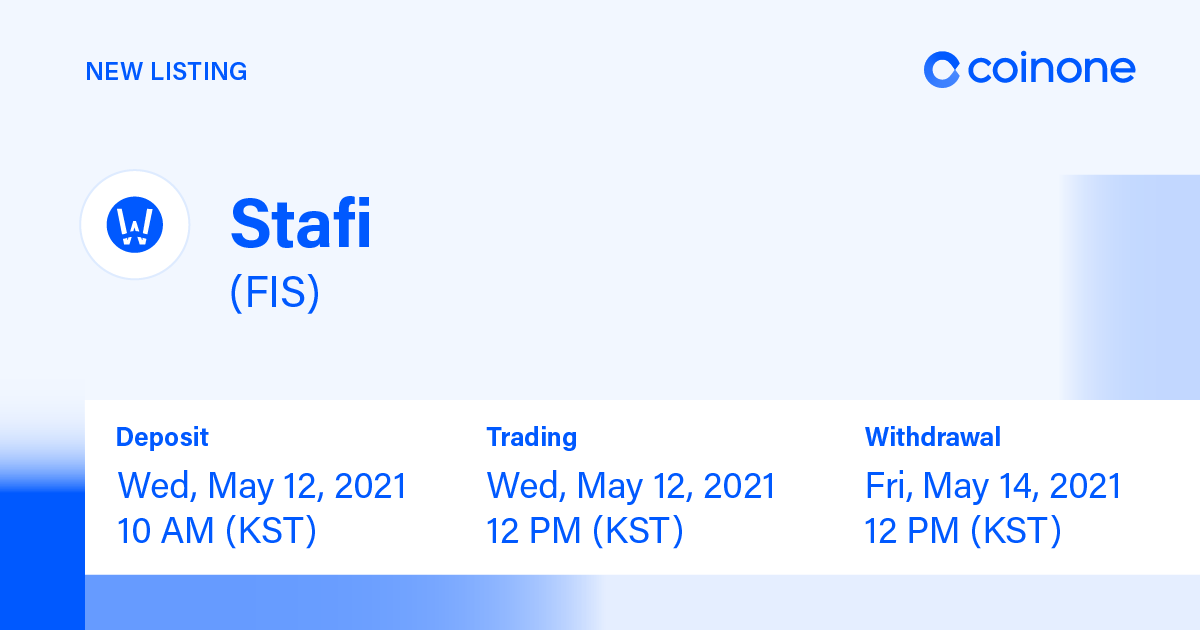 @StaFi_Protocol#스타파이$FIS 코인원에 상장됩니다. Listing#Stafi$FIS@CoinoneOfficial KRW market. 입금: 2021.5.12 10:00(KST) 거래: 2021.5.12 12:00(KST) 자세히 보기(More details) https://bit.ly/3bk2KDW pic.twitter.com/yeBJZeaimx