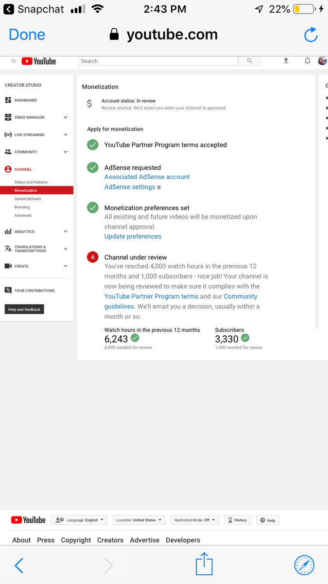 @TeamYouTube here’s a screenshot of my monetization page. Also I would like to thank you for replying it shows you really do care about us. Also here’s my channel link again. I double tweeted just to make sure team gets it. https://www.youtube.com/channel/UCQ8VXZCiEXXEAkkVOrF3uKQ …pic.twitter.com/lg8mAF0df3
