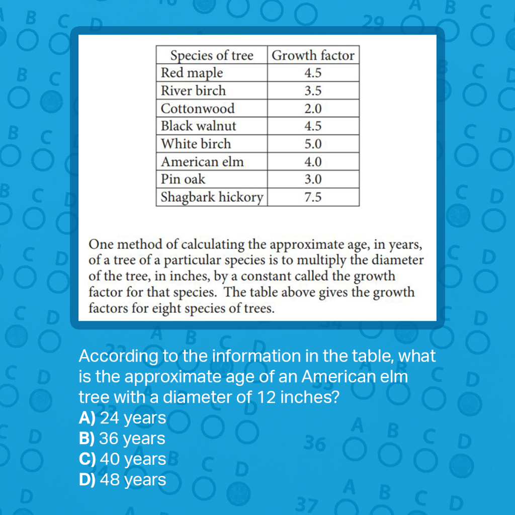 The answer is D. Multiplying the growth factor, 4.0, of the American elm given in the table by the given diameter of 12 inches yields an approximate age of 48 years.