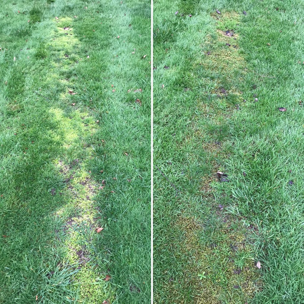 Applying moss controls this morning. By dehydrating the moss it shrinks and prevents it from spreading. These pictures of the same area taken just 1 hour apart, so it’s fast acting too!!