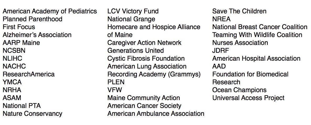 Trump's tenure as POTUS has induced Susan Collins to move from calling him unsuitable for office to thinking about endorsing him for 2020. All these orgs--and anyone contemplating aligning with Collins--should give that careful thought.