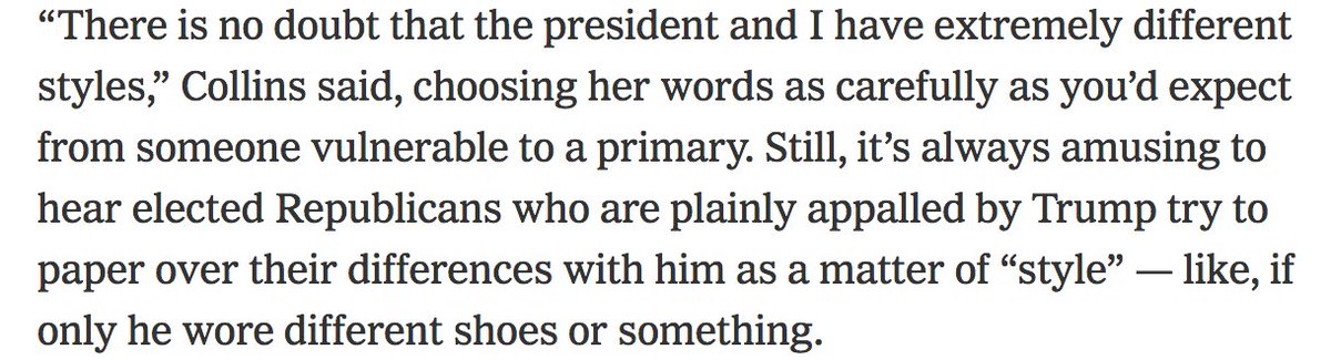 Inference Collins is counting on folks to draw: There 's no meaningful divergence btwn her/Trump on policy. Difference is cosmetic.