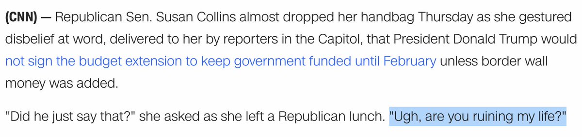 Susan Collins said she opposed funding Trump's wall--and letting the wall force a shutdown--as recently as Nov 26, explaining her opposition this way.