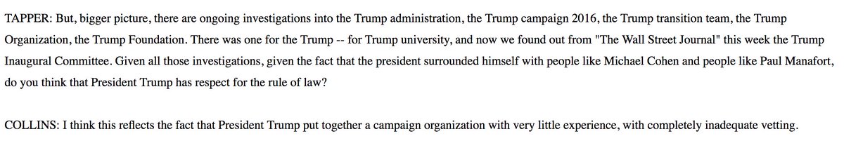 I missed this: Susan Collins attributes swirl of corruption around Trump to his political inexperience and poor vetting of staff. Hmm.