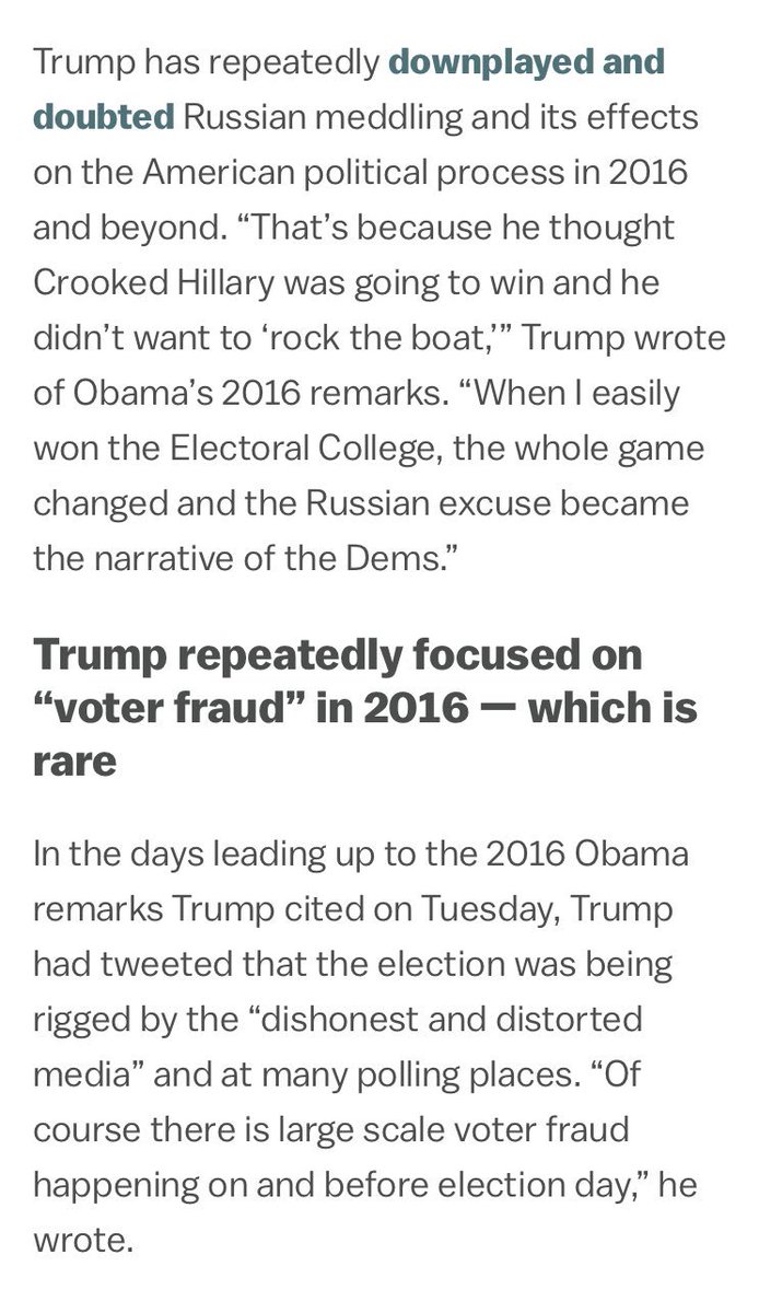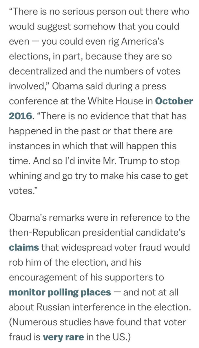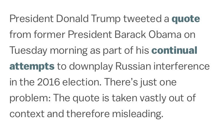 @POTUS@realDonaldTrump & his supporters cite a misleading@BarackObama quote to say Russia didn’t interfere in the election. Obama was talking about voter fraud — not Russia.https://www.vox.com/policy-and-politics/2018/2/20/17032210/trump-obama-rigged-election-russia …