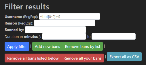 Gift the gift of forgiveness or just clean your Twitch chat banlist for the new year. My chat ban manager lets you remove all bans (or just some) in your channel with ease. https://twitch-tools.rootonline.de/chatban_manager.php …pic.twitter.com/3RmYCeLYid