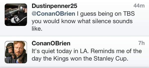 @ConanOBrien: It's quiet today in LA. Reminds me of the day the Kings won the Stanley Cup.” THIS