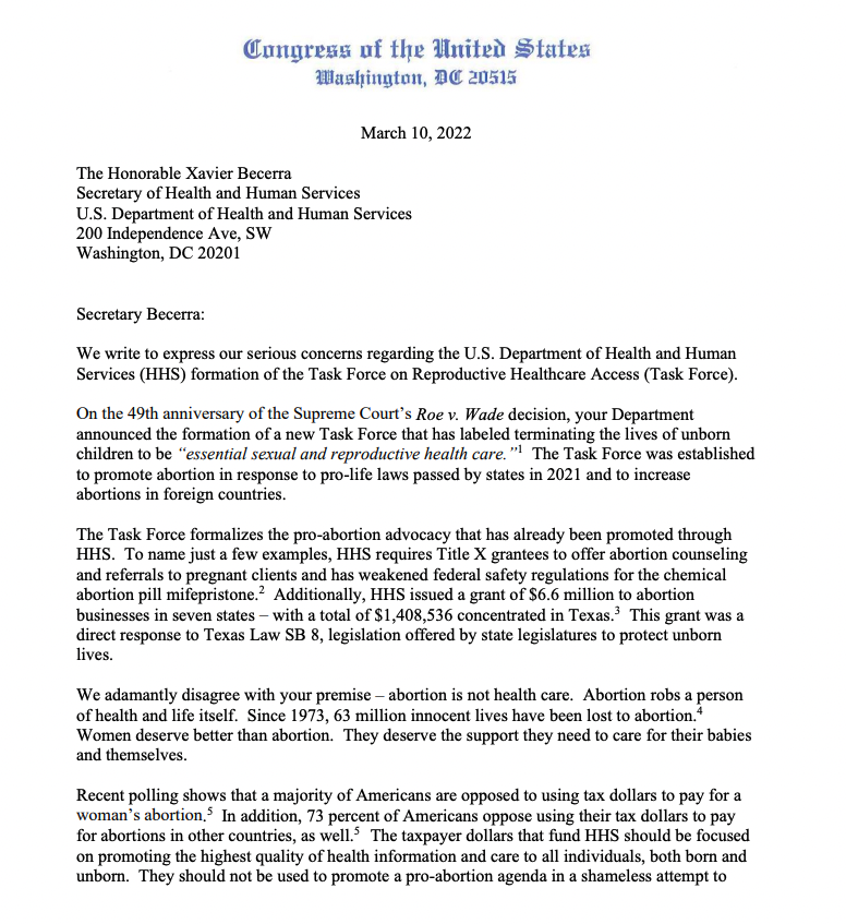 @RepBuddyCarter letter to@SecBecerra voicing concerns about this pro-abortion task force. Tax-dollars should not be weaponized by HHS to promote abortion. I am and always will be pro-life.https://twitter.com/RepBuddyCarter/status/1503742626381672459 …