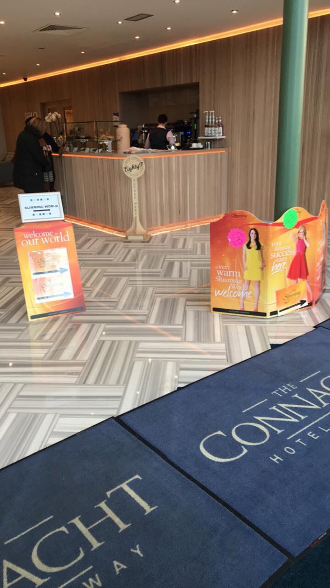 We are hosting group in the Ryan Room in the Connacht hotel today take a right turn when you enter the front entrance along the green living wall You will see my yellow signs out lighting the way