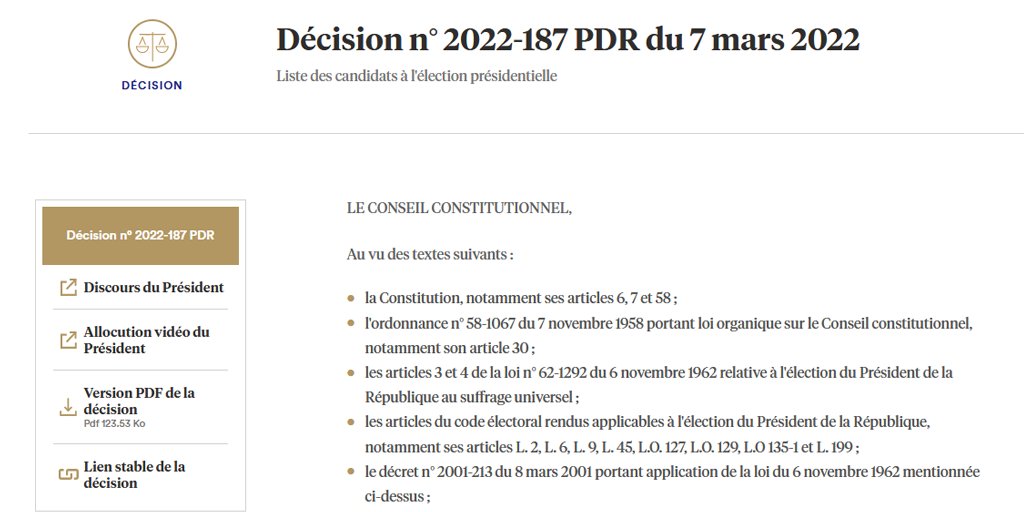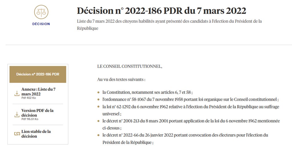 Décision n° 2022-187 PDR du 7 mars 2022, Liste des candidats à l'élection présidentielle https://www.conseil-constitutionnel.fr/decision/2022/2022187PDR.htm …pic.twitter.com/9mDhCJOz1g