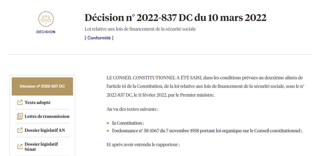 Décision n° 2022-837 DC du 10 mars 2022, [Loi relative aux lois de financement de la sécurité sociale] Conformité https://www.conseil-constitutionnel.fr/decision/2022/2022837DC.htm …pic.twitter.com/kM3ZHhaICG
