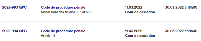 Saisines des affaires QPC n° 2022-993 et 2022-994 du 11 mars 2022. https://www.conseil-constitutionnel.fr/decisions/affaires-instances?id=32205 …pic.twitter.com/JZTYsAIHyt