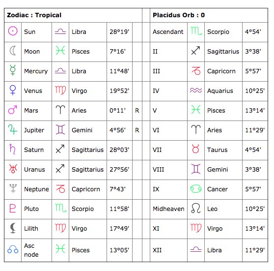 so you're a libra sun (duh), pisces moon, virgo venus, scorpio rising. moon in pisces means that you can put yourself into other people's shoes easily, but you tend to lose yourself in the suffering of others.