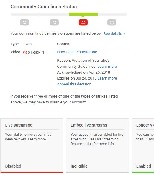 I got a strike on my channel for a vlog of me picking up my testosterone and explaining how I got it prescribed. This is honestly horrifying because there's nothing I can do to contest and after 3 of these they can delete my channel. FOR TALKING ABOUT TESTOSTERONE @TeamYouTubepic.twitter.com/sE5sida0U7