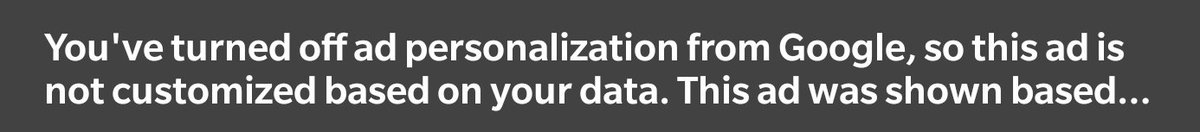 oh hey @TeamYouTube. dialogue for when trying to view the reasoning of why a user is getting a particular ad w/ ad personalisation is turned off is missing a closing parentheses and the title gets truncated. this is on android. may need to adjust the text presented.pic.twitter.com/2FOrgD3y3J