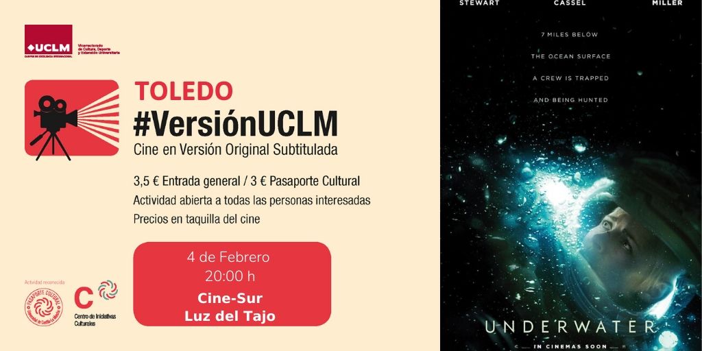 #VersiónUCLM Toledo: Underwater 4 febrero, 20:00h. Cine-sur Luz del Tajo. Actividad reconocida por el Pasaporte Cultural. http://ow.ly/y0aV50ybFMU pic.twitter.com/FRuqdnNLTW