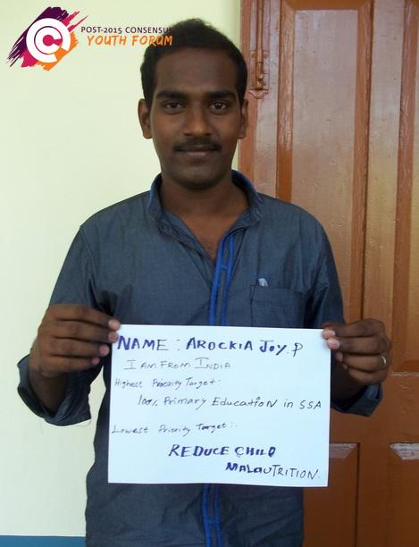 Arockia Joy wants the #UN to prioritize a ‘100% primary education in sSA’ target into #post2015. #showyourselfiepic.twitter.com/Lo7PvaaYvd