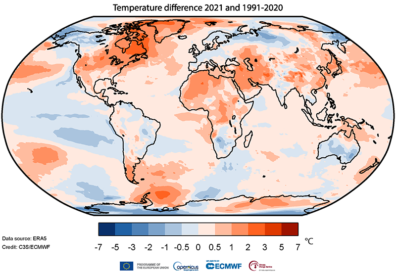 The last seven years were the warmest on record, with 2021 5th but with a small margin to 2015 and 2018. See in the video which regions had the largest geographical anomalies for the year.