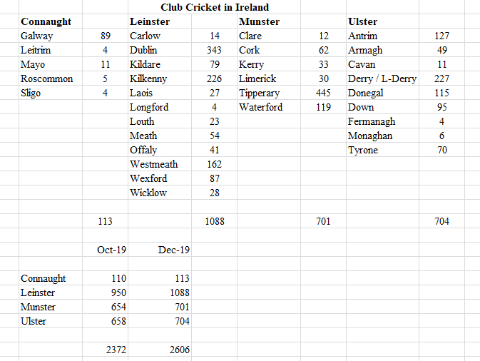 Latest stats on mapping project attached. 2,606 teams identified though lots of areas still to cover in detail. Work is slow, lots of duplication as research continues. Still should be a good representation of cricket in Ireland when done, I hope!