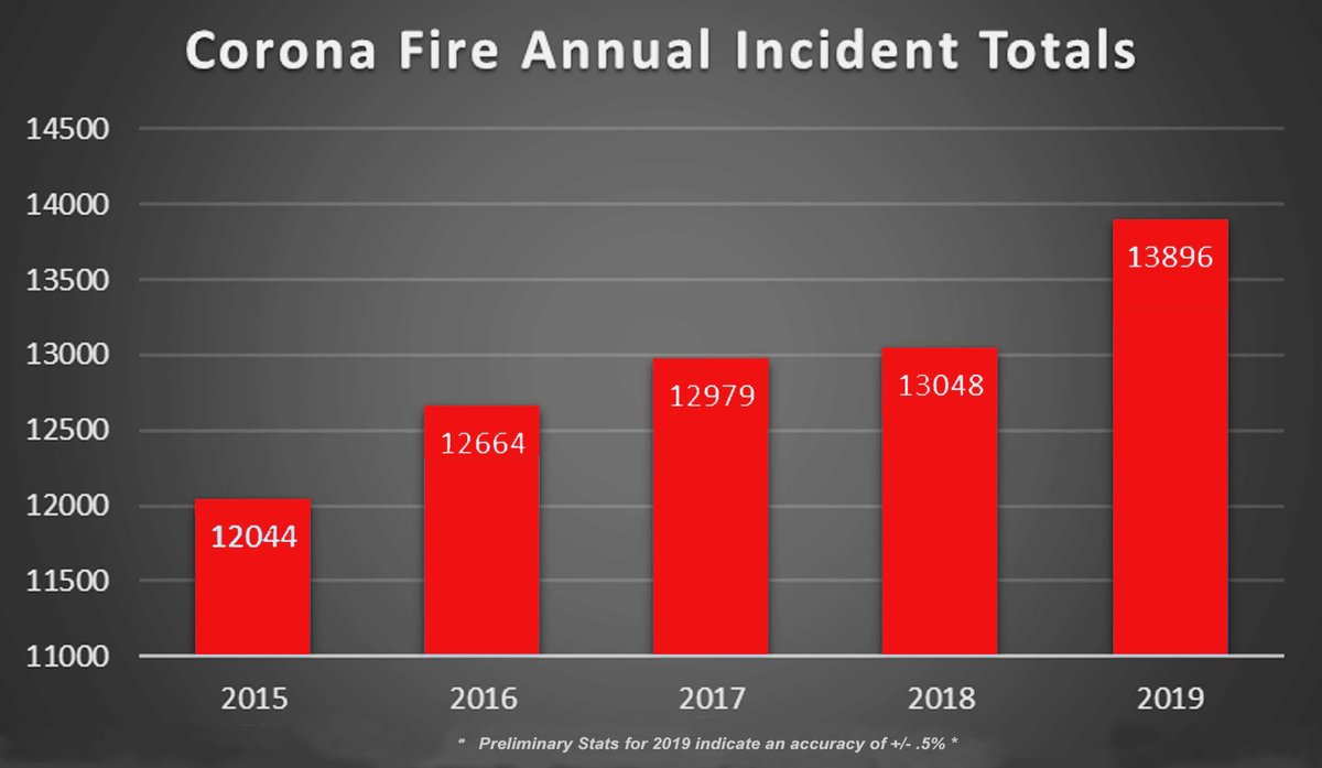 The 2019 response numbers are in! Corona Fire responded to a total of 13,869 incidents last year; up 6.5% from the previous year and 15.3% from 2015! As the demand for service increases, your Corona Firefighters always remain poised and ready to respond to emergencies!pic.twitter.com/hbq6tuGNDL