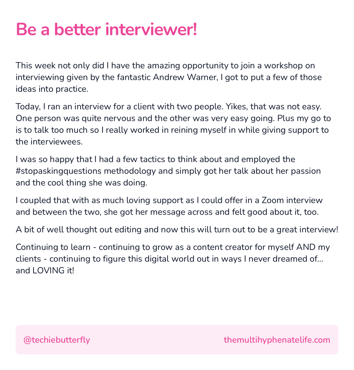 #ship30for30 April 8th Attended a fab workshop this week by@andrewwarner as part of the incredible@espreedevora#podcastbet cohort. Who knew I would need it today! had a difficult interview for a client. Two guests - one nervous. Made it through! Here’s how