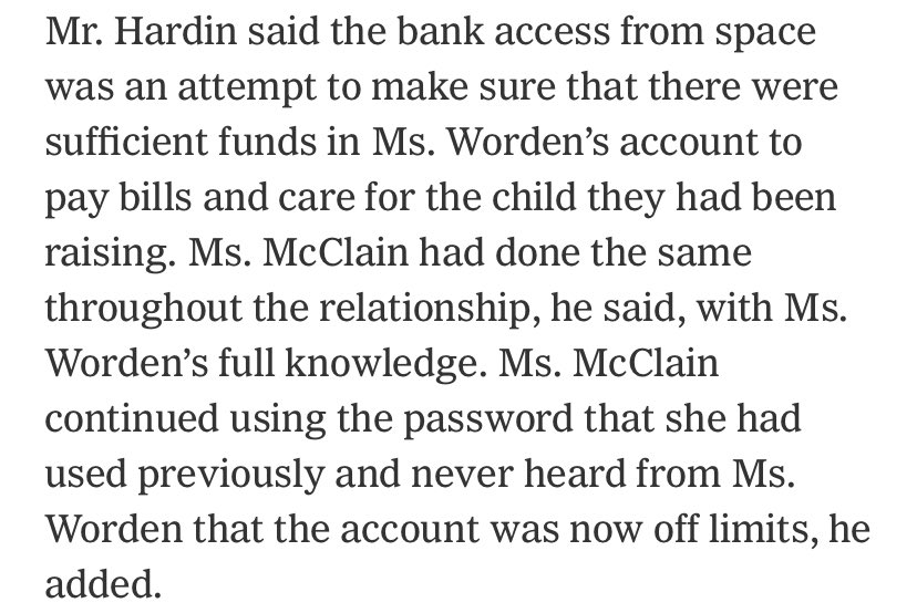 Quite an unfortunate story: How a Bitter Divorce Battle on Earth Led to Claims of a Crime in Space.https://www.nytimes.com/2019/08/23/us/nasa-astronaut-anne-mcclain.amp.html …