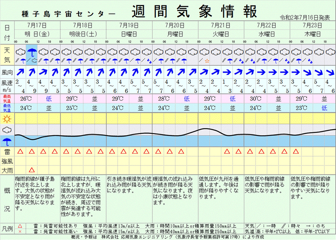supplement table. 雷=Thunder 強風=Strong wind 大雨=Heavy rain No mark=No possibility △=Is possibility ×=Probability is high For one week, thunder forecasts are coming out. It seems that rain and wind are not strong, but there is a danger of lightning and it is NOGO.