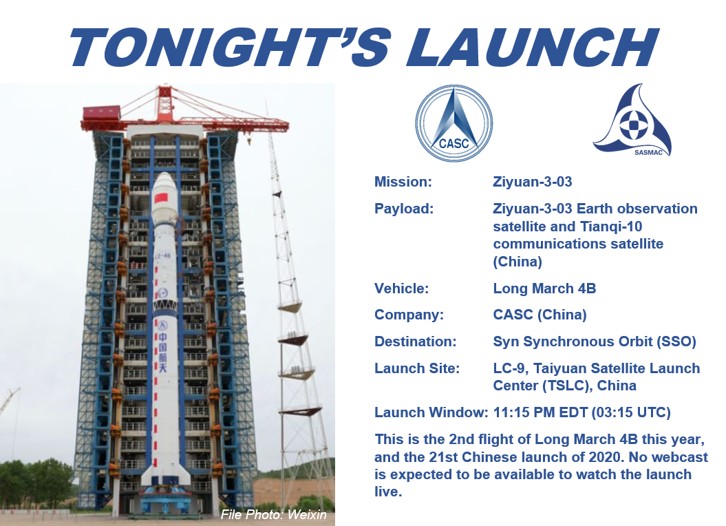 Confirmed launch success with T-0 at 03:13 UTC. In addition to ZY-3-03 and TQ-10 listed here there's also a small "Lobster-eye optics" X-ray astronomy satellite by SAST on board. (@planet4589 do you know of this one?)https://twitter.com/TGMetsFan98/status/1286855839333179392 …