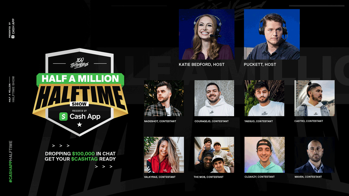 We are now live with the 100 Thieves Half Million Halftime Show, presented by
