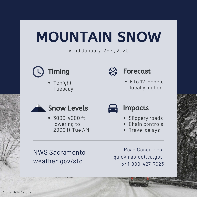 A winter storm will bring mountain snow tonight into Tuesday. Snow levels will range from 3000-4000 feet, dropping to around 2000 feet by Tuesday AM. A Winter Weather Advisory is in effect. Road conditions: http://quickmap.dot.ca.gov