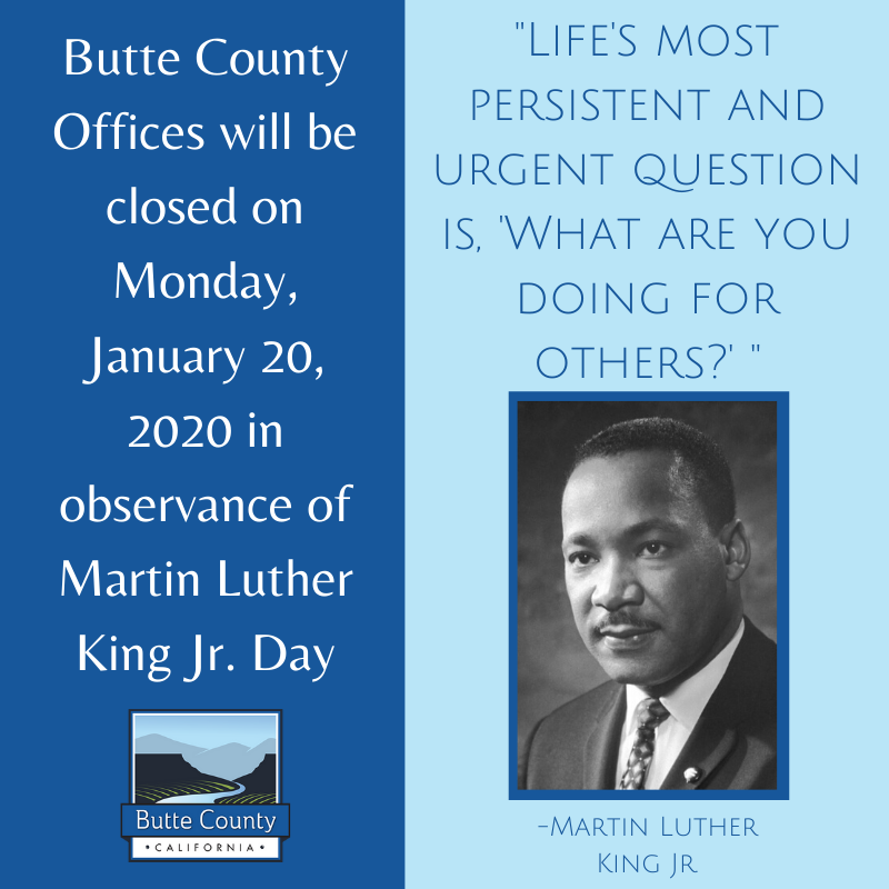 Butte County Offices will be closed on Monday, January 20, 2020 in observance of Martin Luther King Jr. Day.pic.twitter.com/RPK6MMzrgz