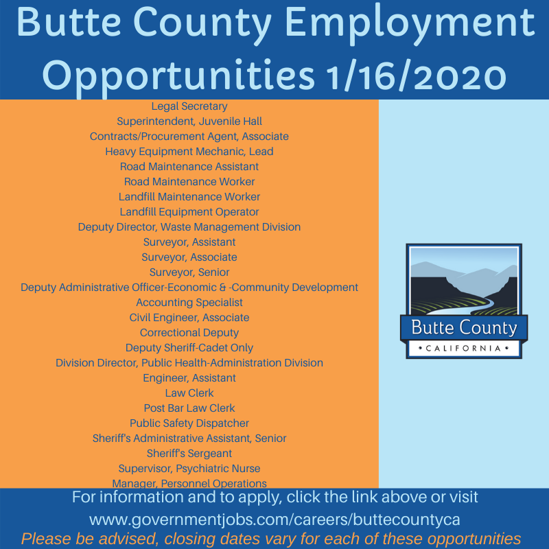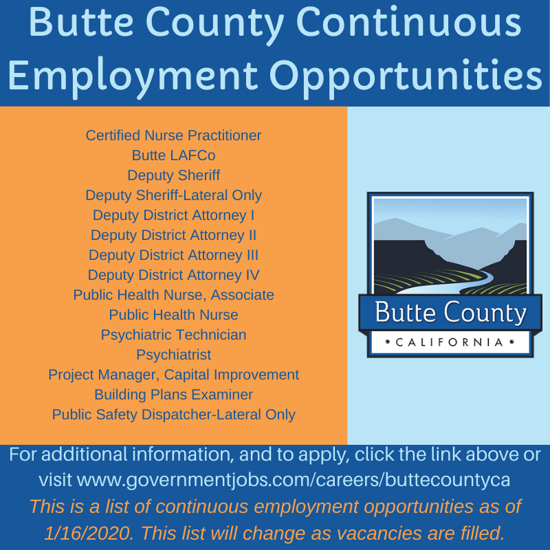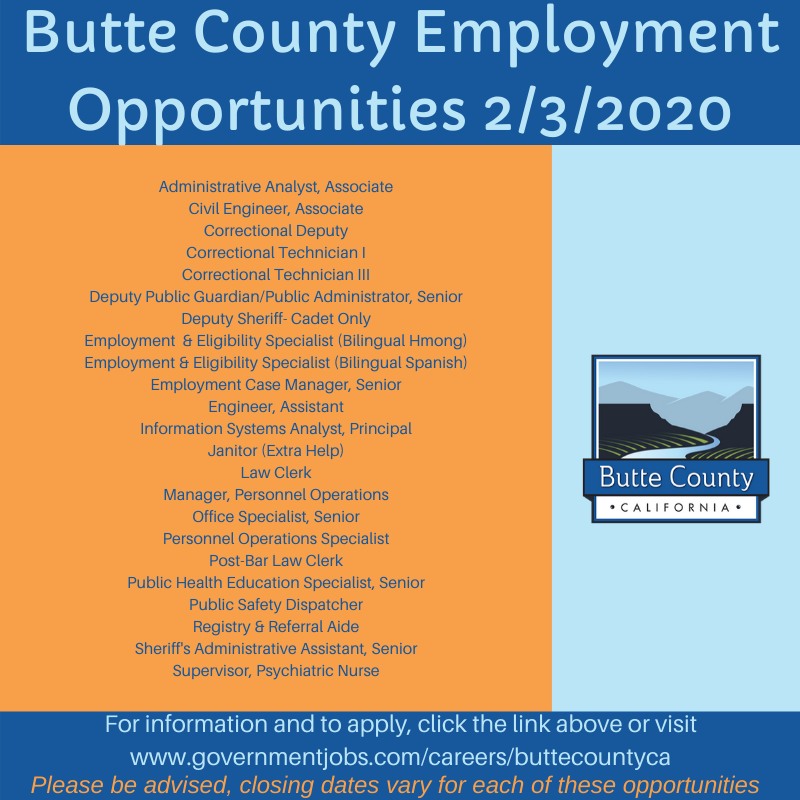 Butte County is hiring. Check out Butte County Employment Opportunities at: https://governmentjobs.com/careers/buttecountyca …