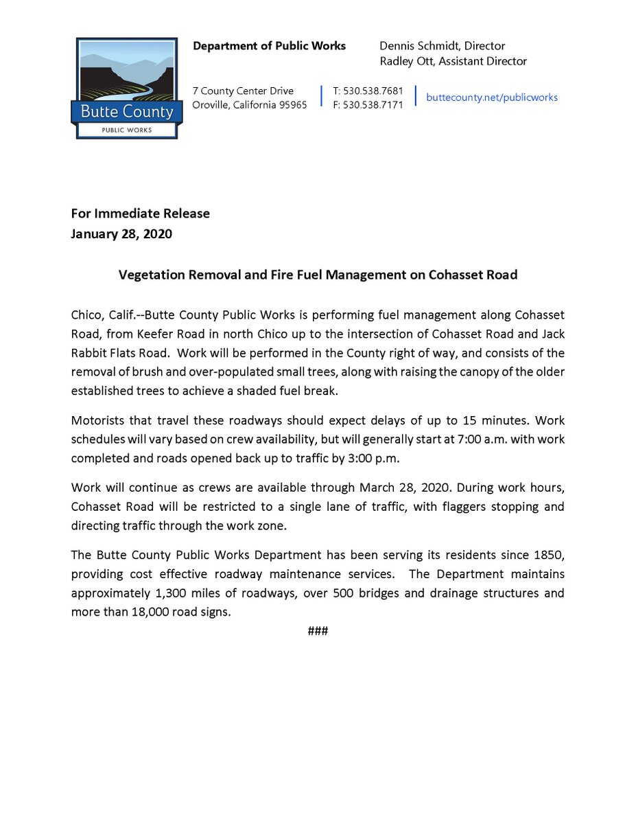 Press Release: Vegetation Removal and Fire Fuel Management on Cohasset Roadpic.twitter.com/qMyY6DaBO5