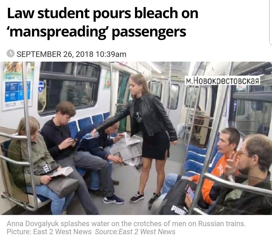 Anna, who calls herself a “social activist”, claims the bleach stains are “identification spots” to “immediately understand which body part controls the behaviour of these men”. >She needs to be locked in a padded room...... https://www.news.com.au/lifestyle/real-life/news-life/law-student-pours-bleach-on-manspreading-passengers/news-story/22addf51059afa33b6decc13f54b8d44 …pic.twitter.com/CS5U5jdl9G
