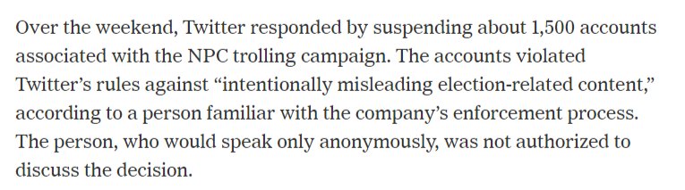 Thank you NY Times for the timely patch Before I had to say "StrLookup - reason for ban not found" Now I can say "Banned for spreading false election content" #orangemanbad #resist #NPCMemeDehumanizes https://www.nytimes.com/2018/10/16/us/politics/npc-twitter-ban.html …pic.twitter.com/ZVvfKBtsRZ