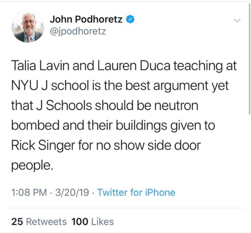 I don't know who these people are, but this is one of JPod's better tweets, actually. Do JPod's followers own any neutron bombs? I doubt that the Strategic Air Command will neutron bomb NYU. (But it is the 16th Anniversary of the Iraq Attaq, so stupider things have happened...)pic.twitter.com/fln6qp1KuW