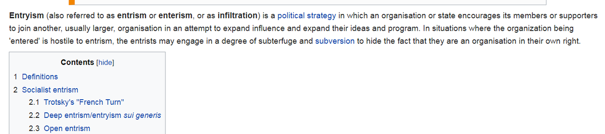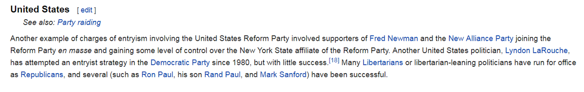 Wikipedia on Entryism is hilarious Starts with history - assorted communists - then in the example section for the US: "Some guys from another party joined the Reform party and I unno some libertarians run as Republicans" Somehow they missed the example of wikipedia 🤔pic.twitter.com/dwTLqOIThJ