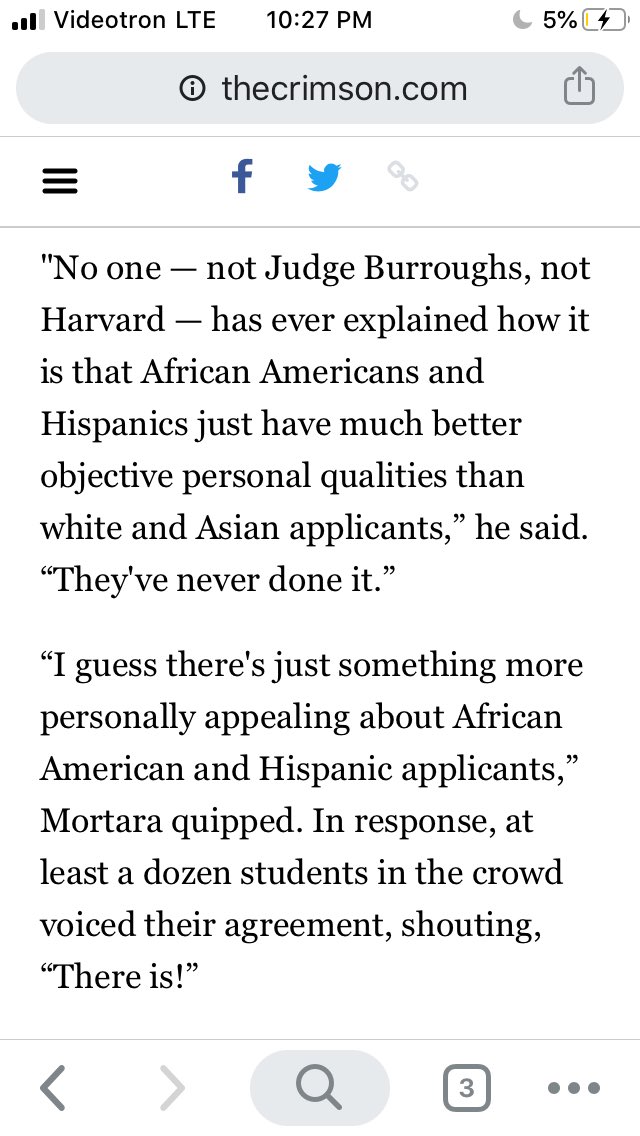 “I guess there’s just something more personally appealing about African American and Hispanic applicants,” Mortara quipped. In response, at least a dozen students voiced their agreement and shouted back “there is!” https://www.thecrimson.com/article/2019/10/9/sffa-lawyer-criticizes-ruling/ …pic.twitter.com/7MqqIDCgIx
