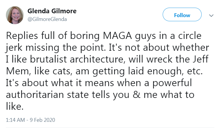 USG is going to keep constructing buildings but if it *stops* doing so in a way that people hate, it's an authoritarian imposition. Catering to Glenda Gilmore's preferences, on the other hand, is as natural as a sunrise. https://twitter.com/GilmoreGlenda/status/1226434202989735936 …