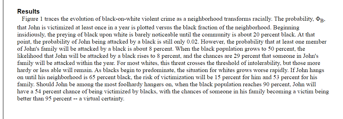 That's not true though. Exactly analogous to saying that the risk of death by jumping into a woodchipper is near zero because last year there were zero fatalities from it. That crime rate is *after* people take massive measures to avoid black people. Look at RE prices.