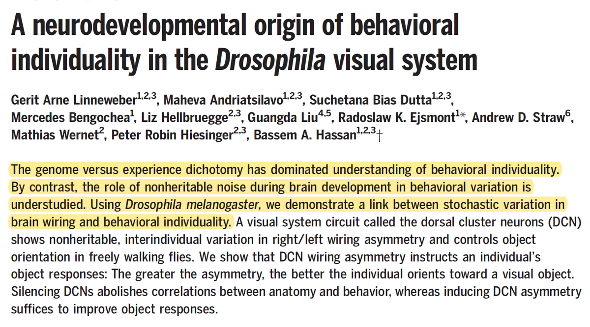 Individual differences are not just due to nature and nurture. They're also due to noise – i.e., random variability in brain development. Nice demonstration in fruit flies. https://science.sciencemag.org/content/367/6482/1112 … User-friendly version: https://phys.org/news/2020-03-fruit-nature-nurture-responsible-individuality.html …pic.twitter.com/2SPcgiYoVq